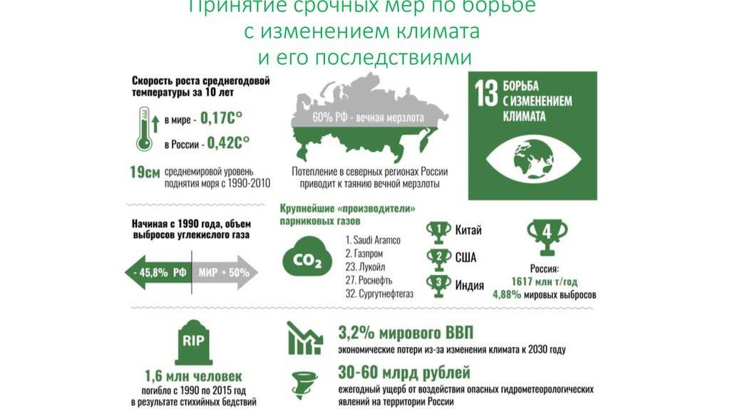 13 цель из ЦУР — Принятие срочных мер по борьбе с изменением климата и его последствиями.